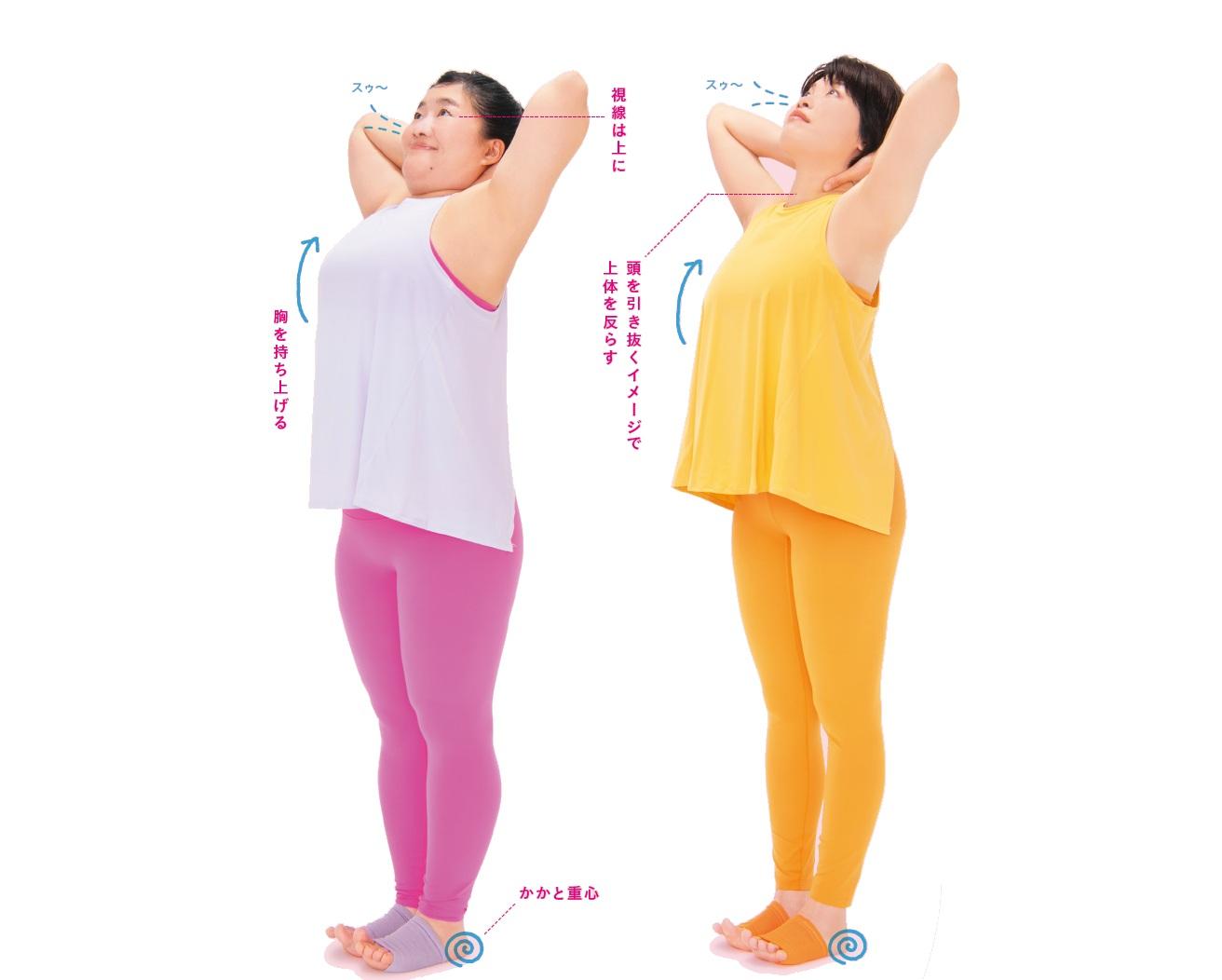 4、両手で頭を引き抜くように力を入れたまま、息を吸いながら、頭を少し後ろに傾けて、頭のてっぺんをできるだけ遠くにするように上体を反らす。このとき、両ひじを天井方向に押し出しながら行うとよい。2~5呼吸キープ。