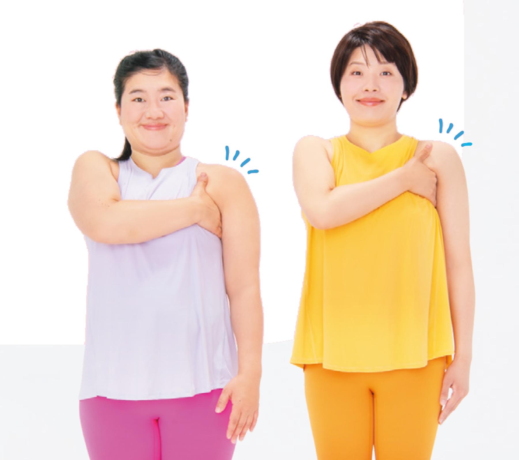 1、右手で左の胸(大胸筋)を下から押さえながら持ち上げる。