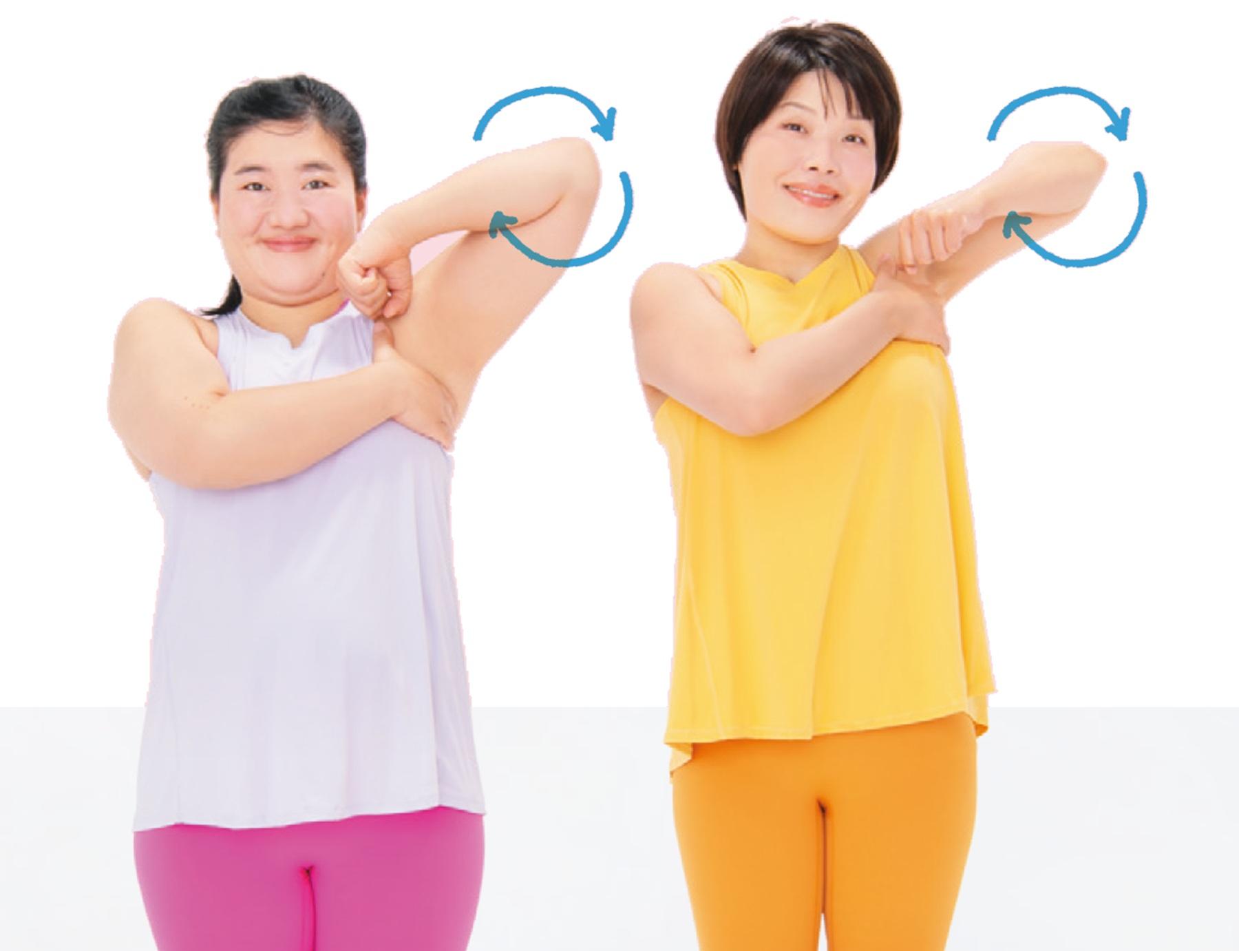 2、左ひじを曲げて、ひじで大きく円を描くように、後ろ回し、前回しを各3~5回行う。