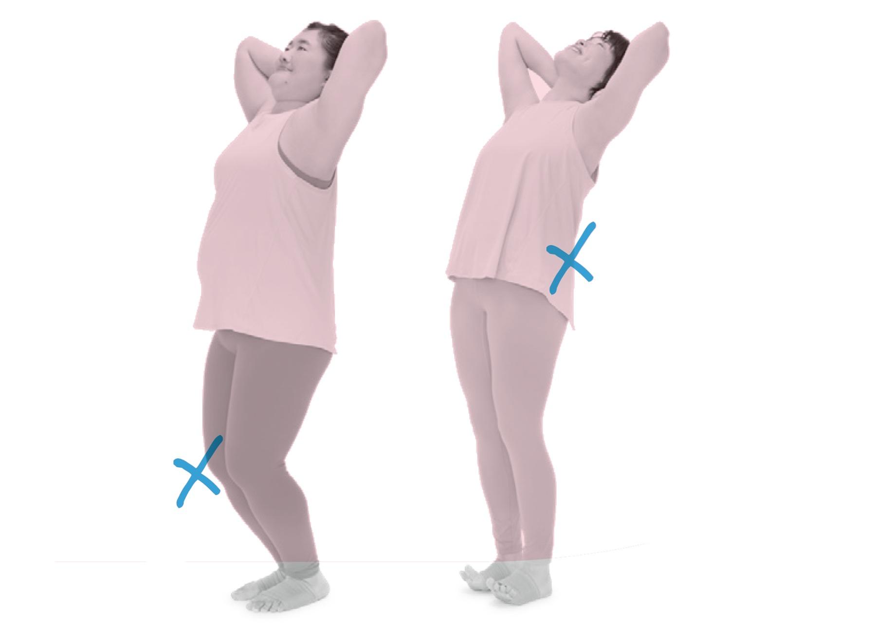 右・反ろうとする気持ちが強すぎてしまい、骨盤を前に出して腰を反らしてしまっている…。