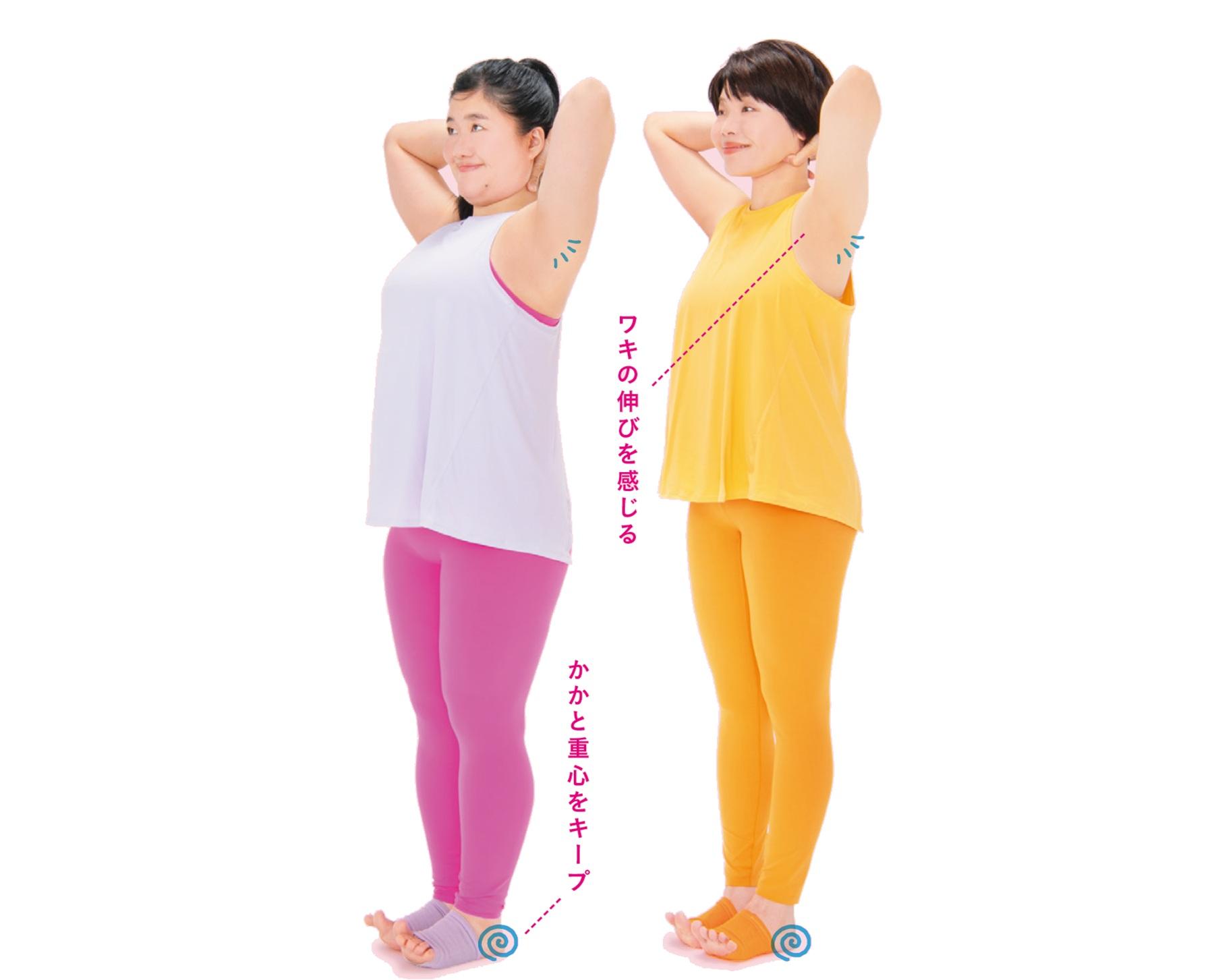 腕を上げて上体を反らすことで腹横筋や腹斜筋が機能し、お腹が凹む。