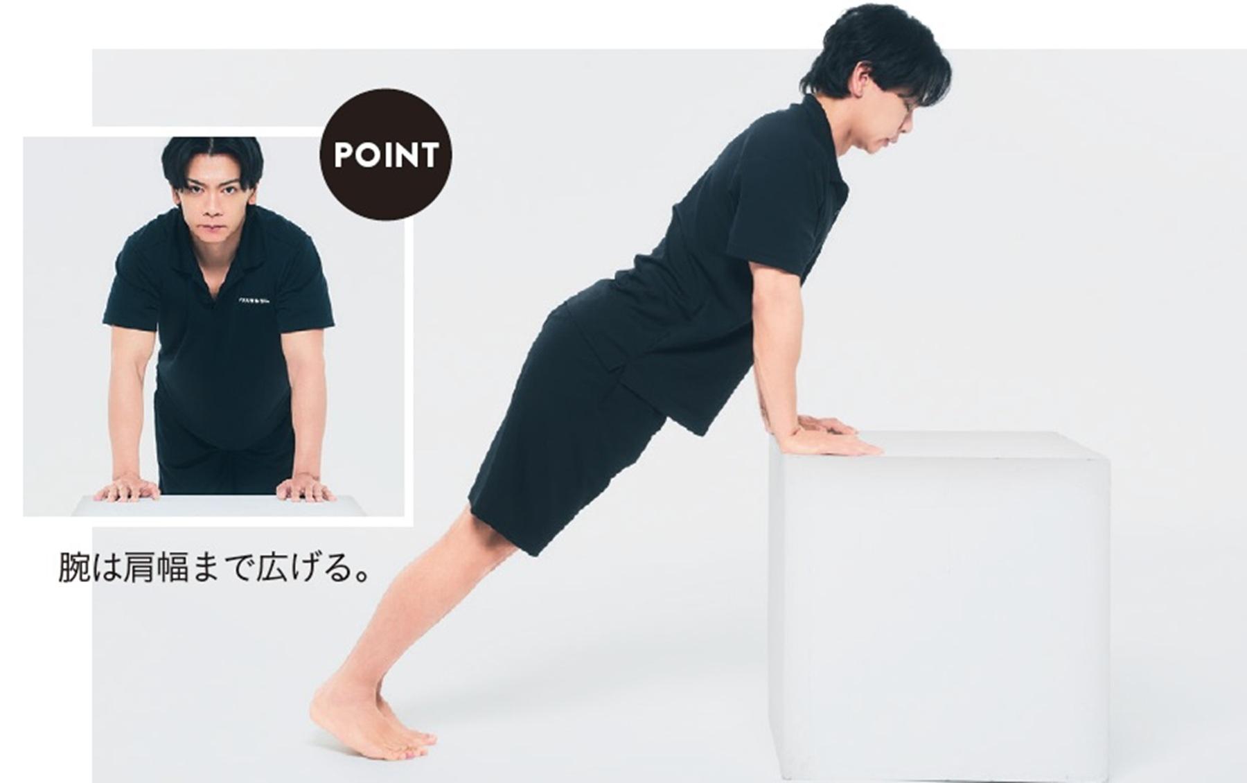 自重トレの基本は“押す”動作。まずは、手を置いた面を押して上腕三頭筋を鍛える腕立てからマスターを。「床で行う通常の腕立ては、苦手な人も多いはず。キッチンなどの台を使うと負荷が軽くなり、初心者も挑戦しやすくなります」
