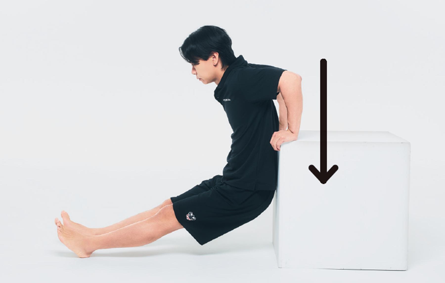 1、台を背にして肩幅に開いた両手を縁に置き、脚を前に伸ばす。手のひらの下部を使うため、手全体をベッタリ置くのではなく縁を軽く掴むイメージが正解。