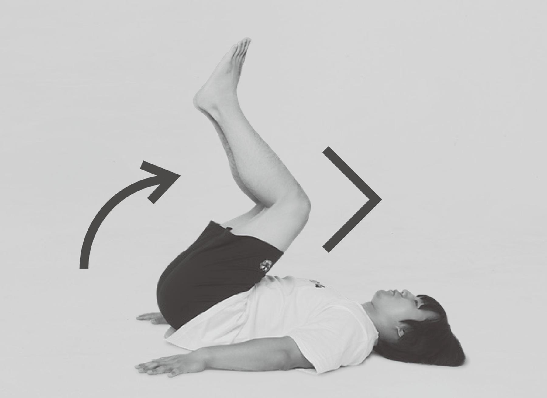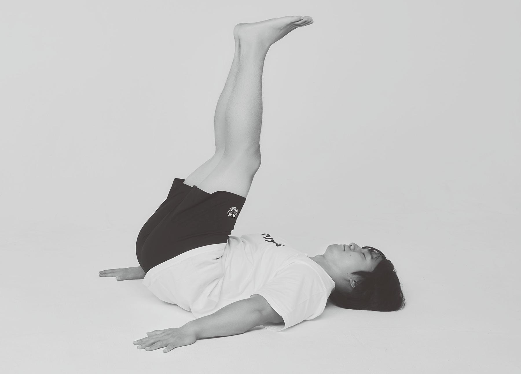 脚を上下する際に力みすぎて腰が浮きがちな人は腹筋不足。慣れるまでは膝を曲げ、負荷を軽くした状態で行って。