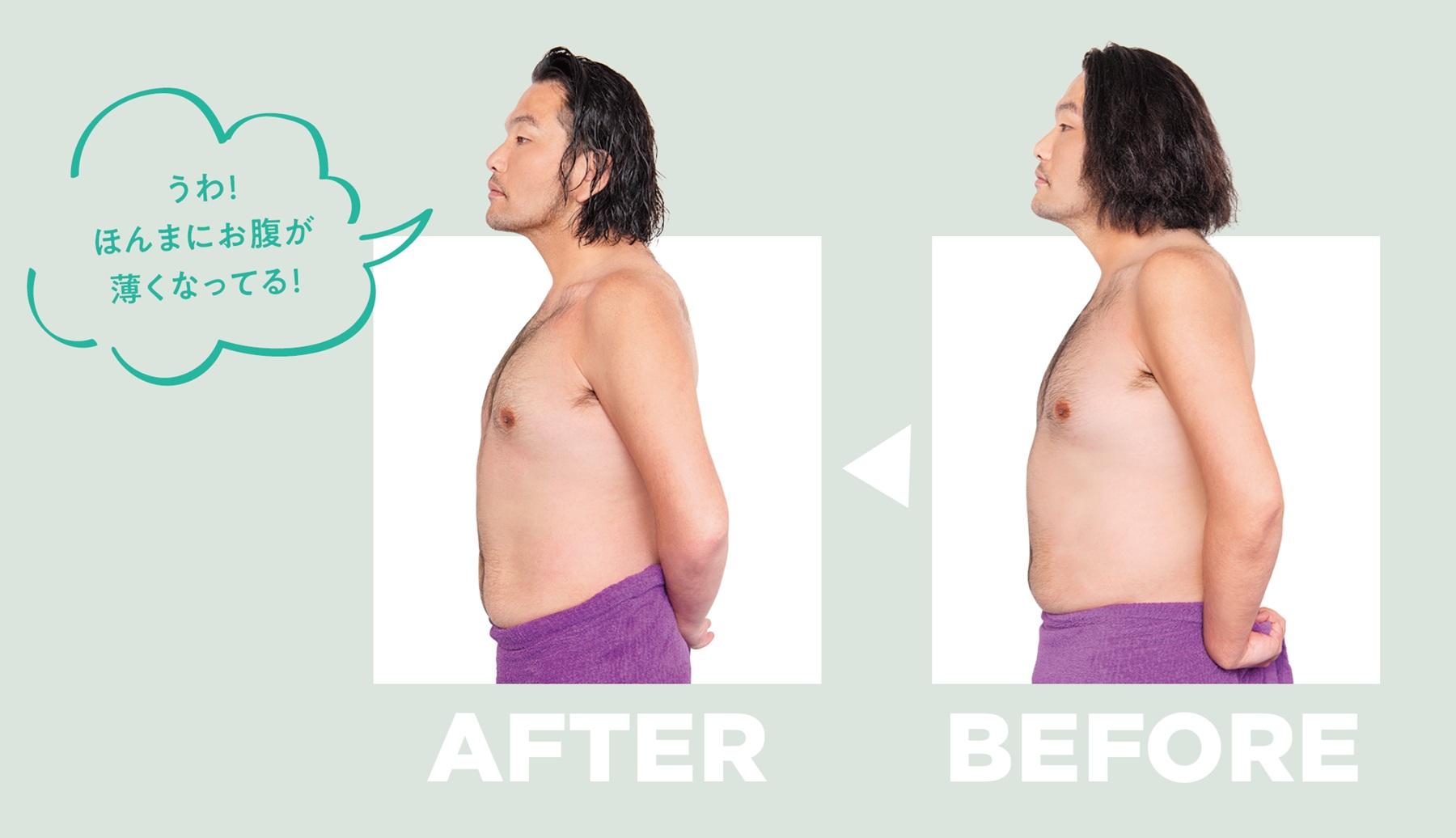 施術直後の変化は一目瞭然! 顔が小さくなり顎まわりや二の腕がスッキリして目もぱっちり。お腹も一回り薄くなった印象。「さっきは憎かったけど、ゴッドハンドですやん! 命の恩人!」