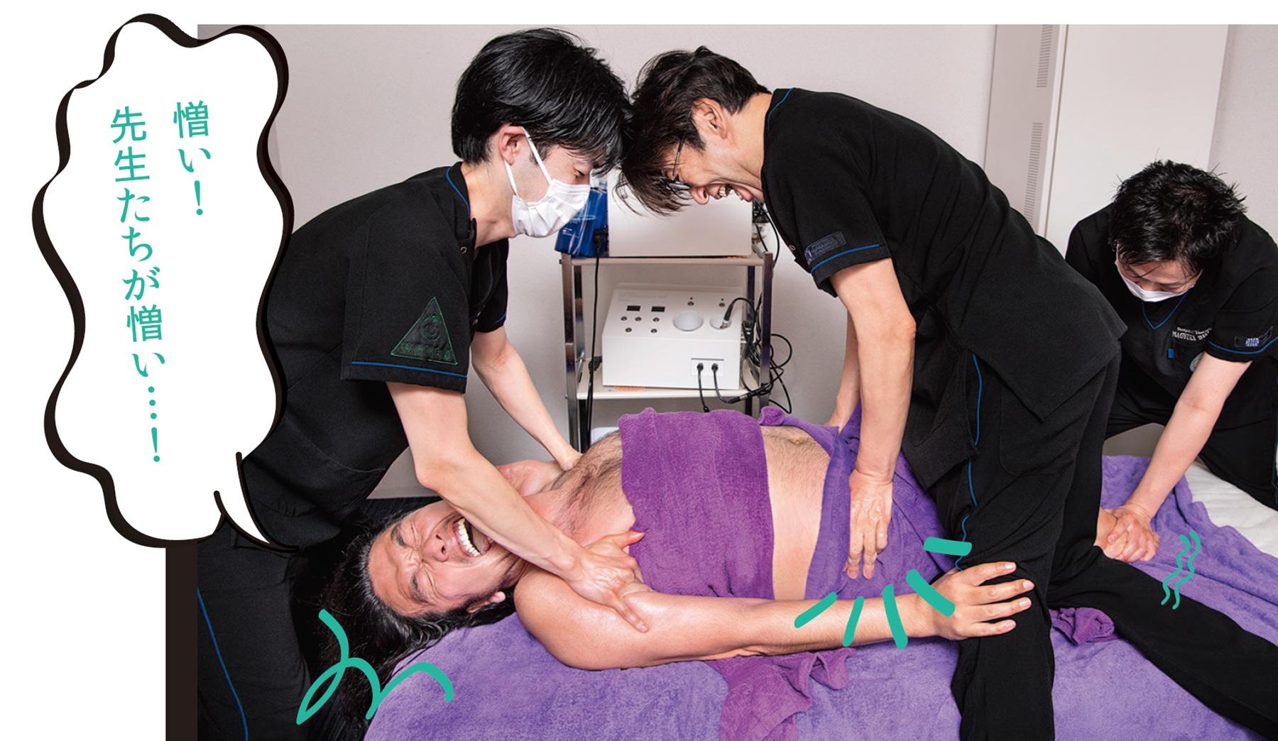 筋肉が硬く流れが悪いほど、痛みや施術後のあざを伴い、ハードに感じる施術。「筋膜の上に脂肪がついている小太り状態」の盛山さんはどうなる…?