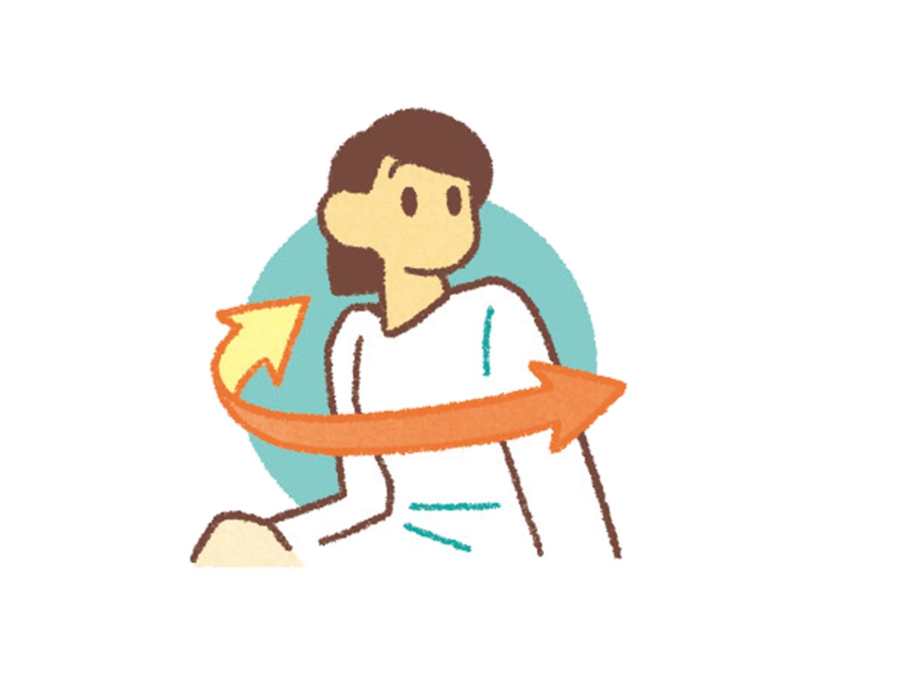左下腹部のS状結腸に便が溜まる。ウンチが出にくい時は上半身をゆっくりひねって腸を刺激し排便を促す。右側だけでなく、左側にもひねる。呼吸もゆっくりすると効果的。