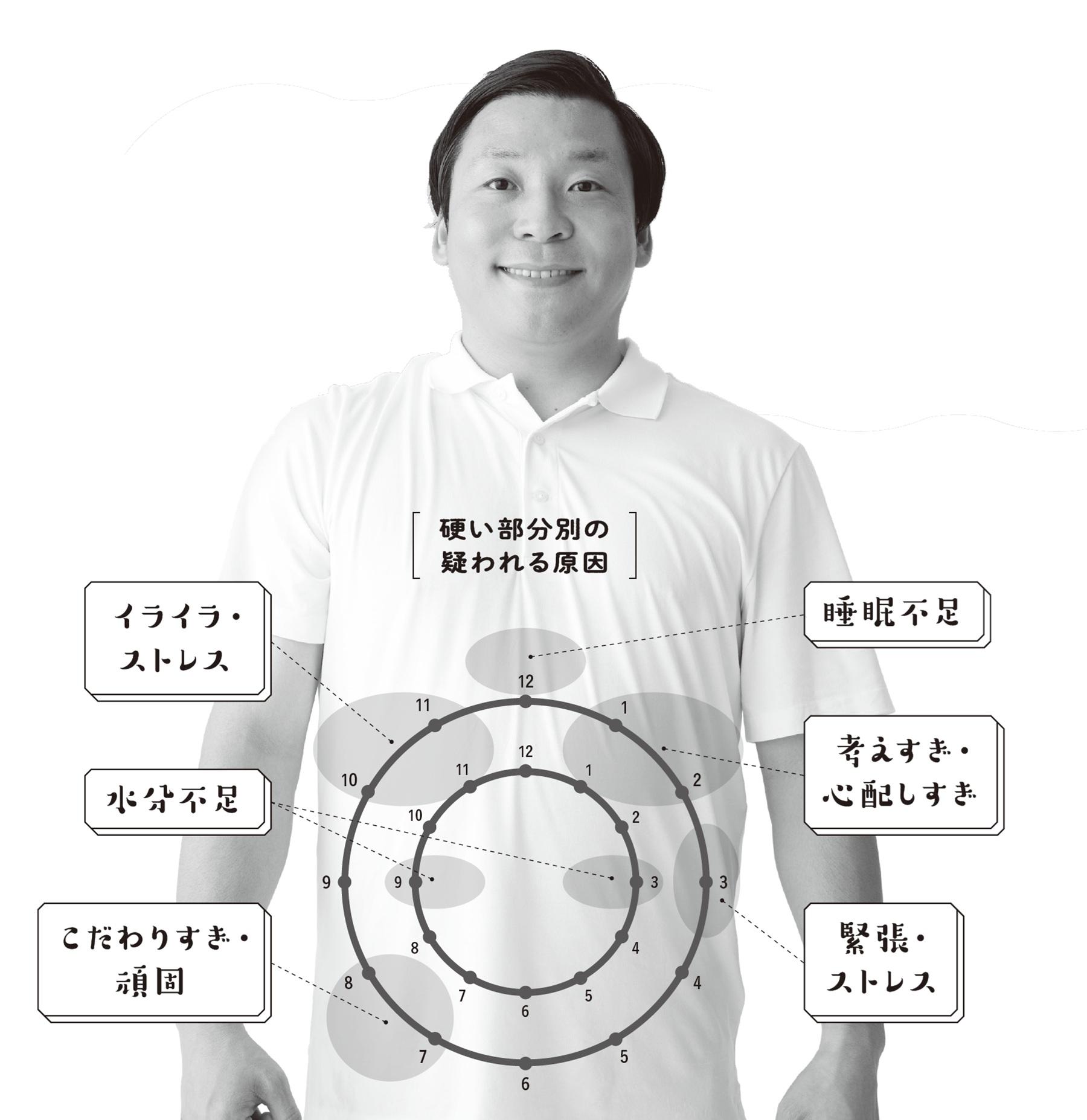 7500人以上のお腹を触ってきた小澤さんによると、お腹を触って硬いところを探ると、心や体の状態を知る手がかりになるそう。下記の“腸内時計”図を参考にして。