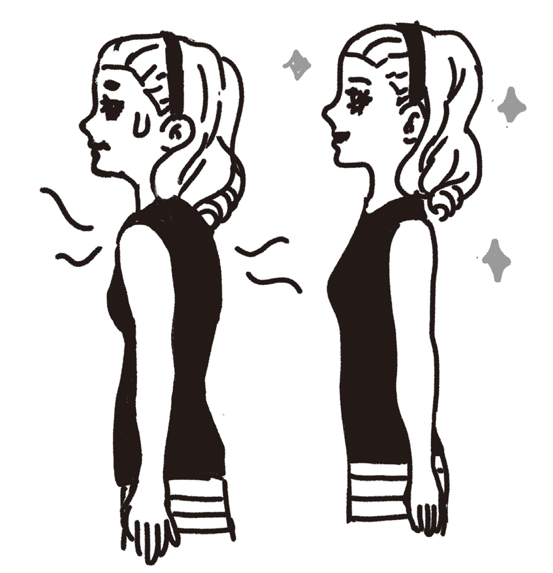 毎日のリセットが、明日のきれいな姿勢を作る! ここでは、本来の位置よりも肩が前に出て、丸まっている状態である“巻き肩”に注目します。