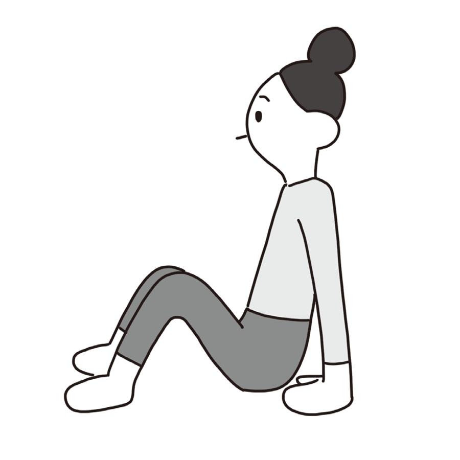 1、膝を立てて座り、足は軽く開く。両手をお尻の少し後ろに置き、肩を軽く引いて胸を開く。