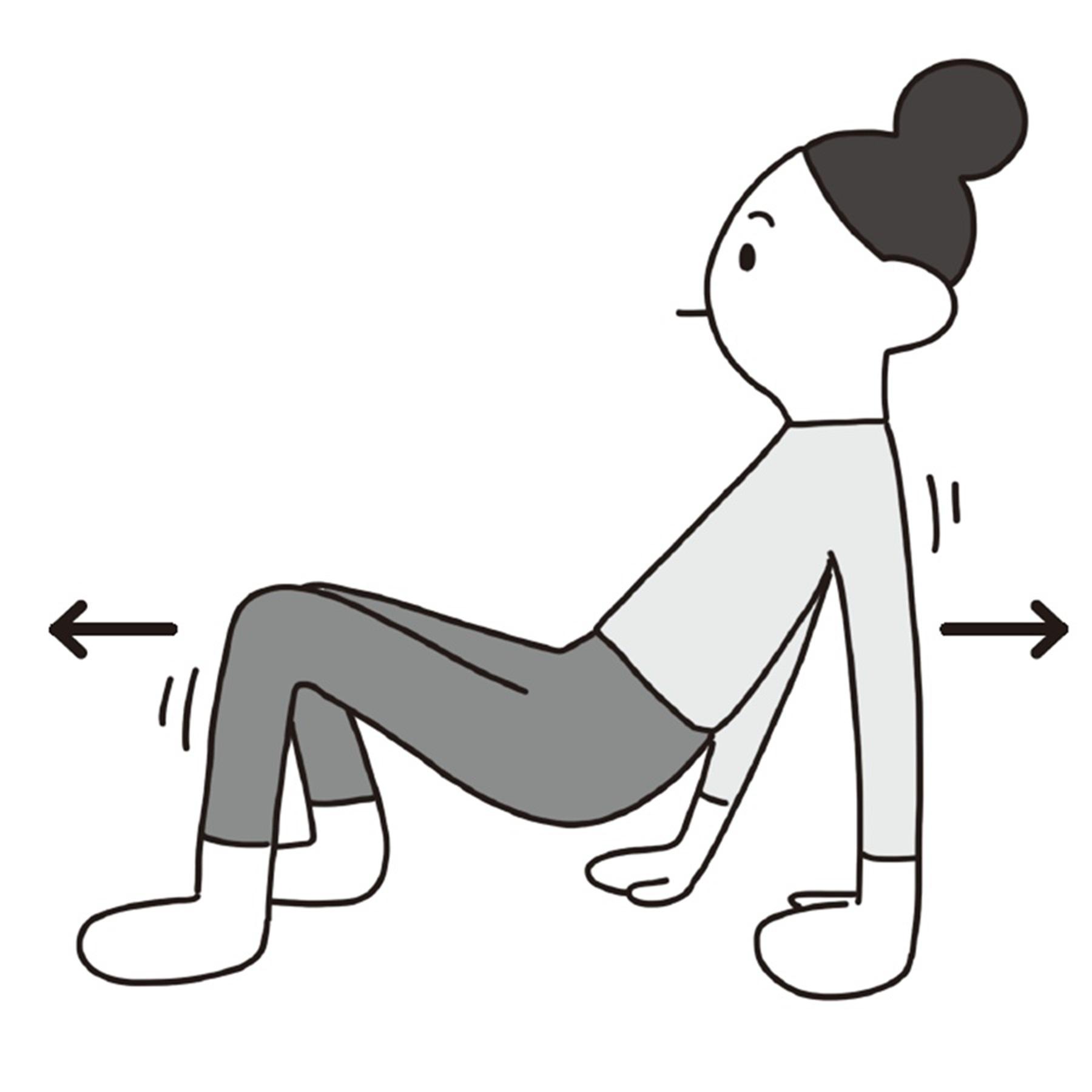 「お尻浮かし」の2の姿勢のままさらにもう少しお尻を持ち上げ、前後に移動するエクササイズ。胸郭や肩甲骨が動くので、上半身の姿勢改善に役立ちます。腹筋に良い影響も。