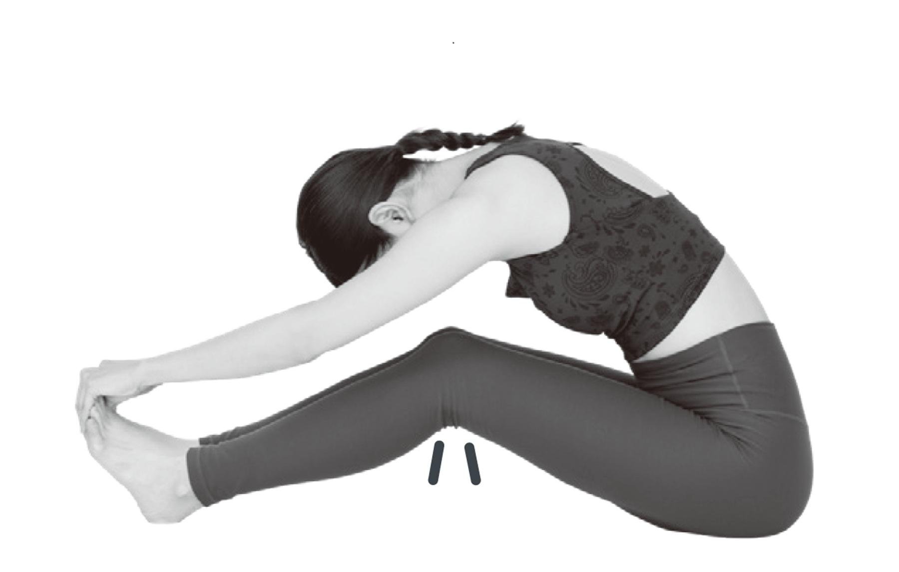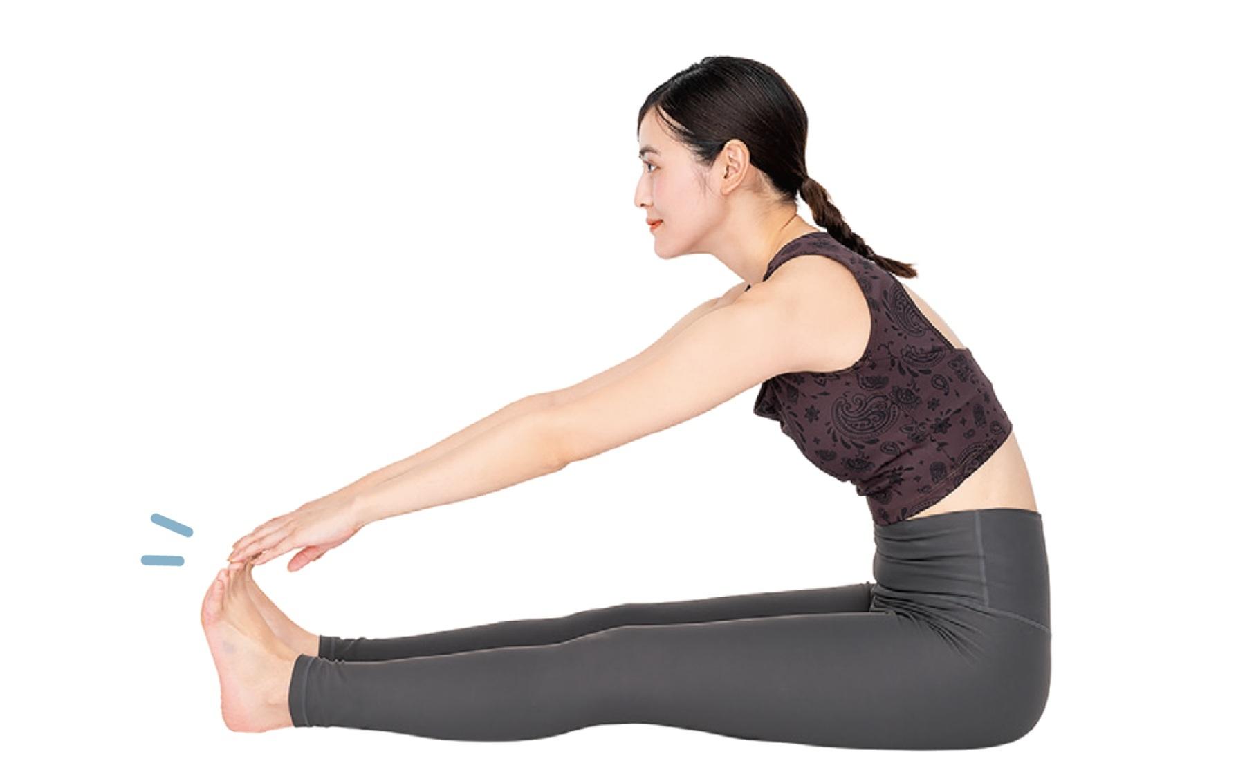 1、両脚を伸ばして座り、指先を足に近づけた長座体前屈の姿勢になる。できる範囲でOK。