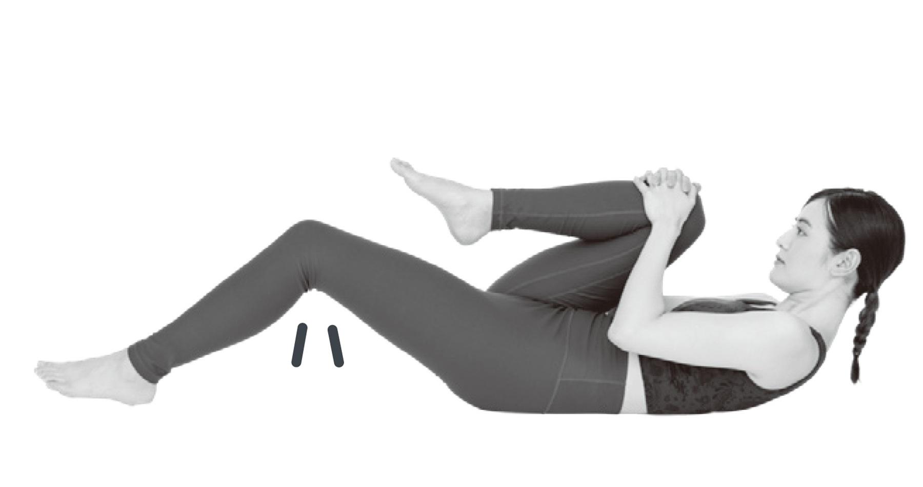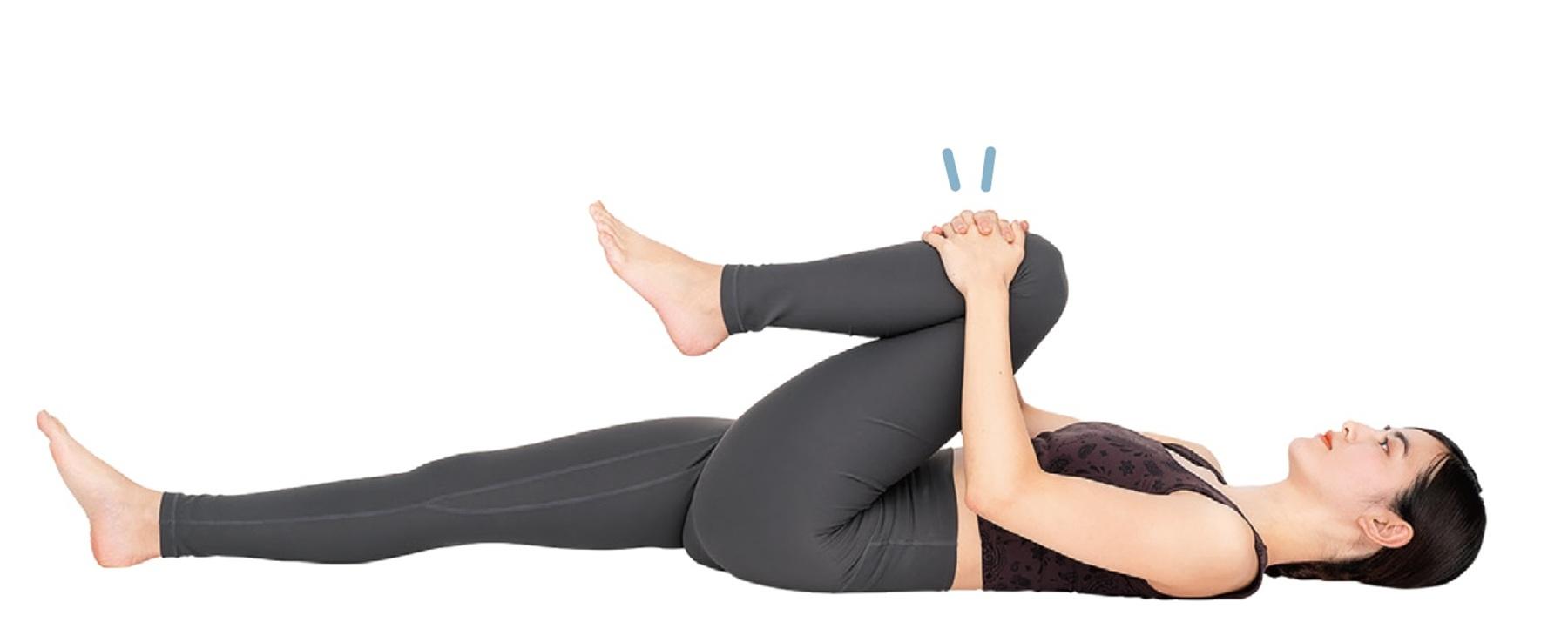 1、仰向けになり、左膝を曲げ、両手で抱える。左の股関節を深く曲げることを意識して。
