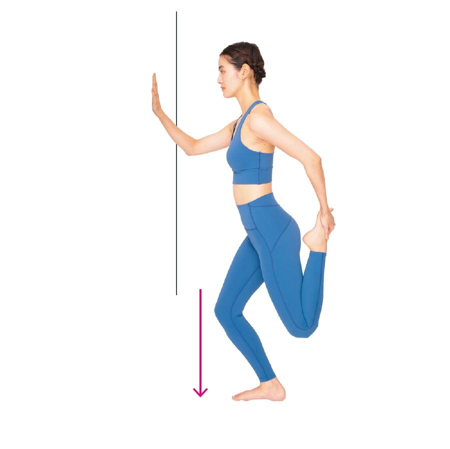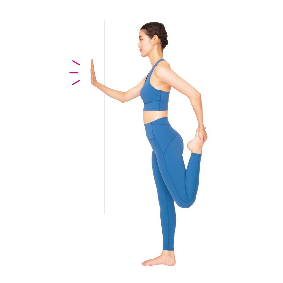 1、壁に右手をつき、左手で左足のつま先を持って太ももの前を伸ばす。