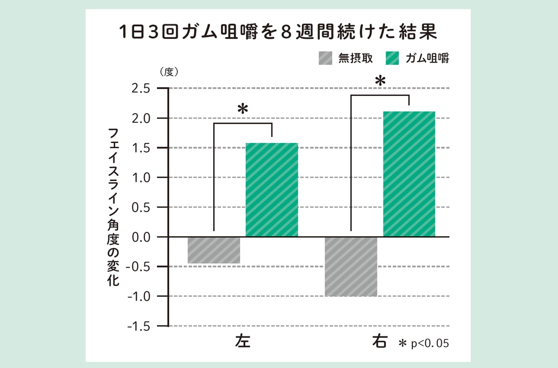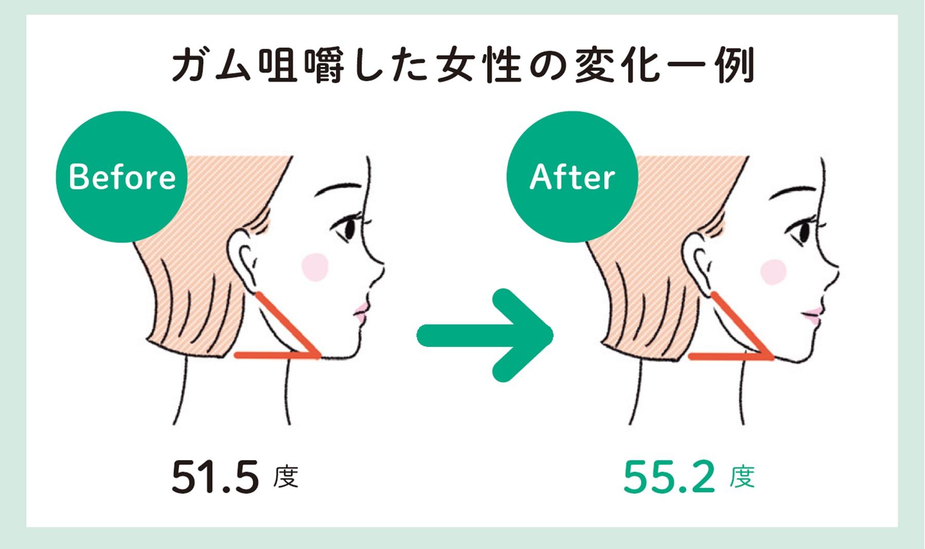 「20~40代の健康な女性を対象に、1回約10分、毎食前1日3回のガムトレを8週間実施した結果、ガムトレをした人としなかった人を比較したら、ガムトレをした人のフェイスライン角度が増加しました。ガムトレを行った女性の変化の一例として、噛む前はフェイスラインが51.5度だったのに対して、8週間噛んだ後は55.2度となり、あご下のたるみが改善されました」(菅野さん)