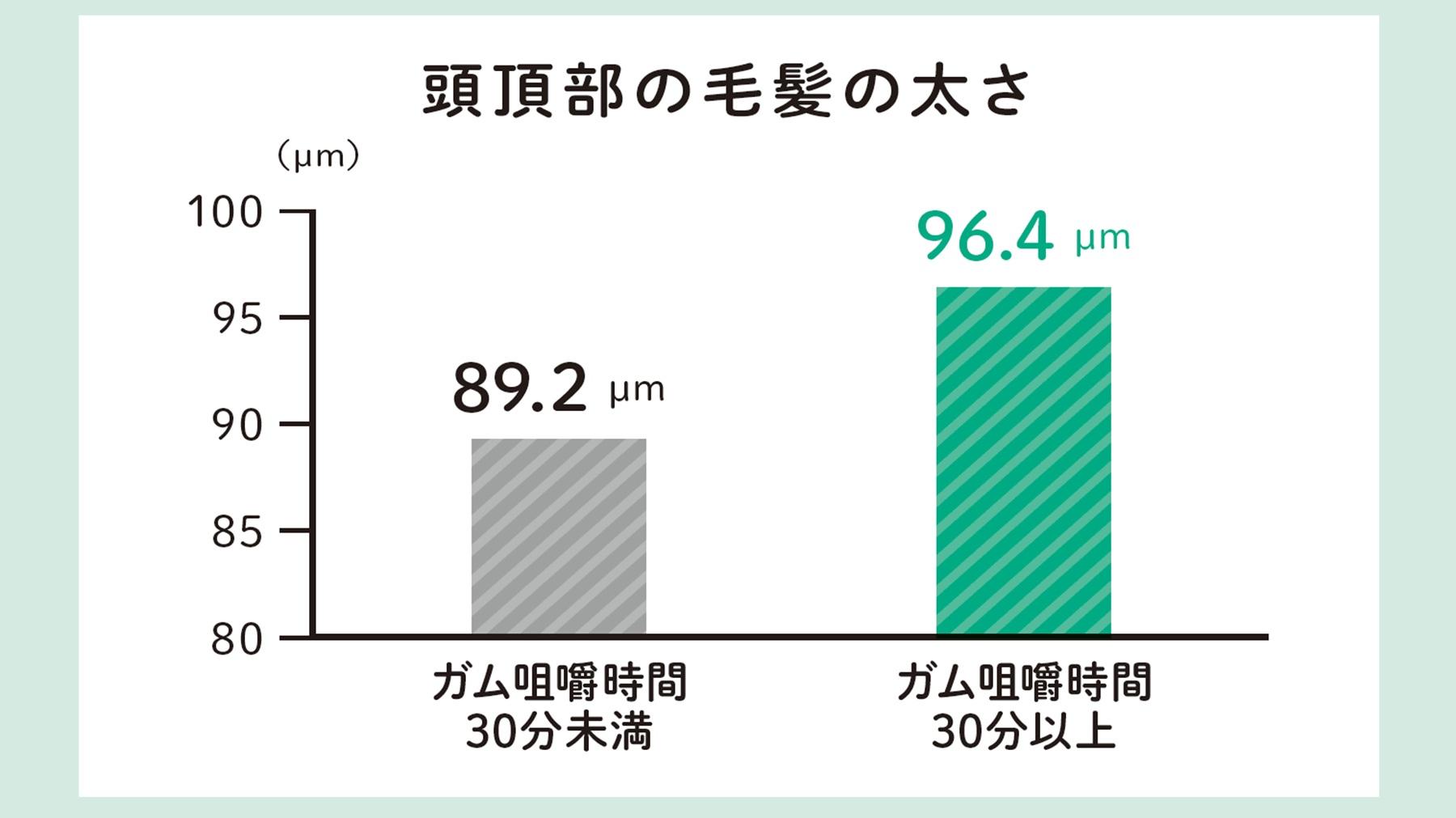 ガムを噛むと、前頭部、頭頂部ともに頭皮血流が増加することが確認され、毛髪にも良い影響が!? 「20~50代の健康な男女を対象に行った研究で、1日の平均ガム咀嚼時間が30分以上の人は、それ未満の人より、頭頂部の毛髪径が太いという結果が出ています」(菅野さん)。ガムの継続摂取前後で毛髪への効果を認めた研究成果はまだ出ていないため、今後に期待したい。