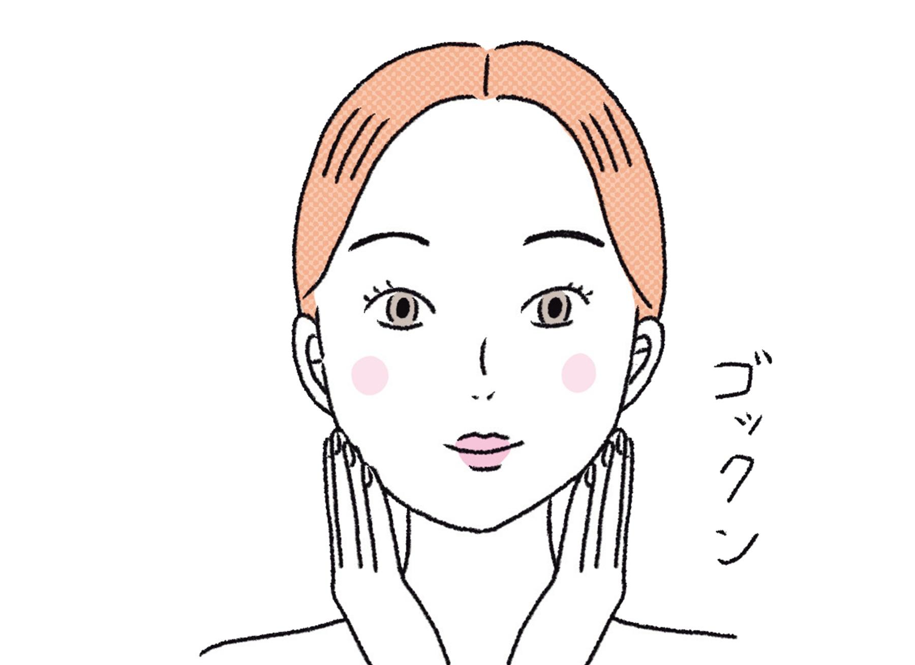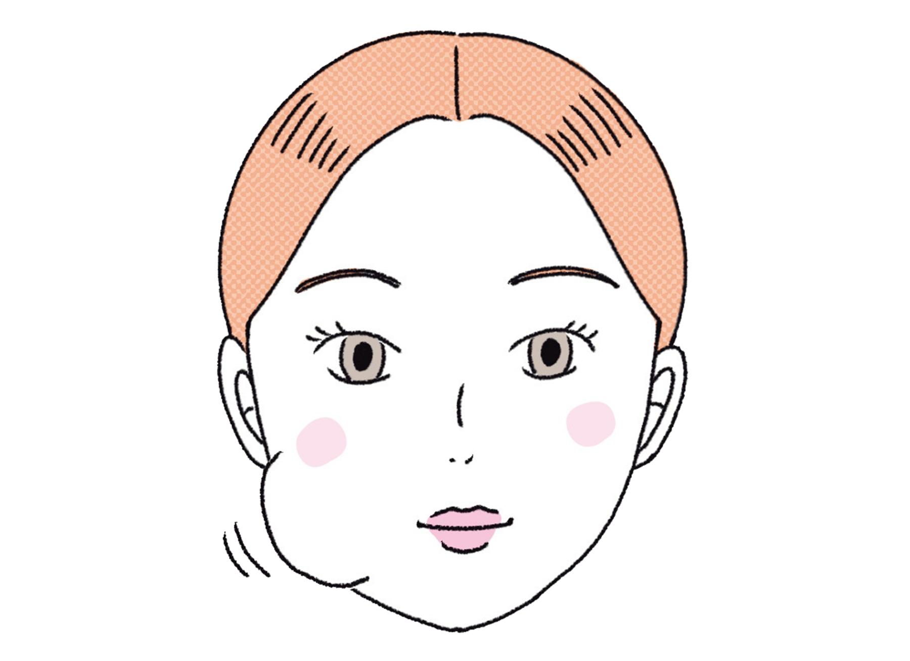 噛みながら頬に手を当てて、左右の咬筋がプクプクと動いていることを確認。大きく噛むことで唾液が出てくる。あまり出てこないようなら、もう少し大きく動かしてみよう。