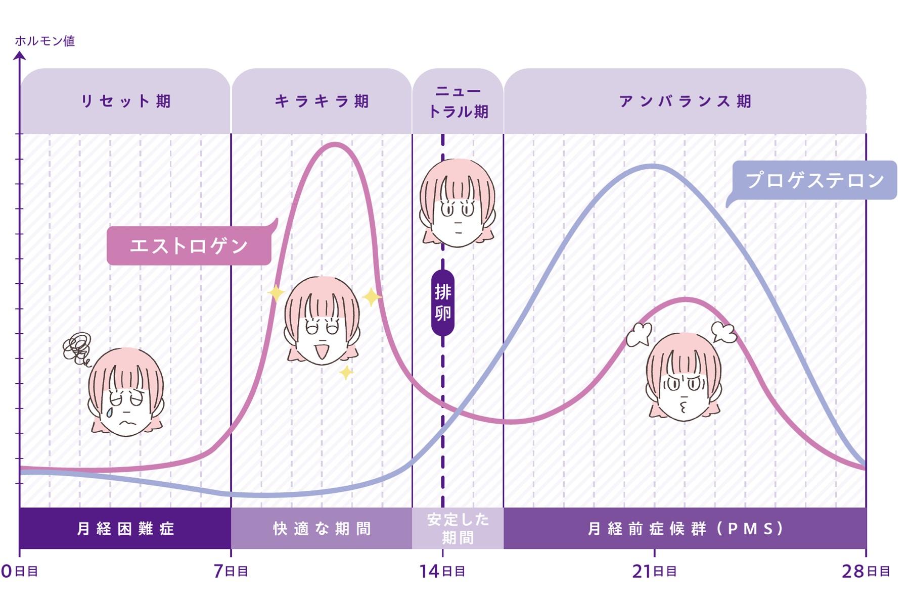 月経周期は4つに分かれ、それぞれ体調や気分に違いがある。その変化に大きく影響するのが女性ホルモン。