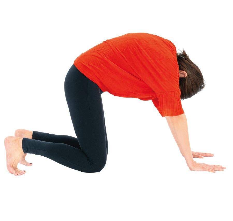 両手は肩幅、膝は腰幅に開いて四つ這いに。息をゆっくり吸いながら、首を長く保つイメージで胸と腰を反らし、背骨まわりの筋肉を緩めて。腰が痛い人は無理して反らさない。