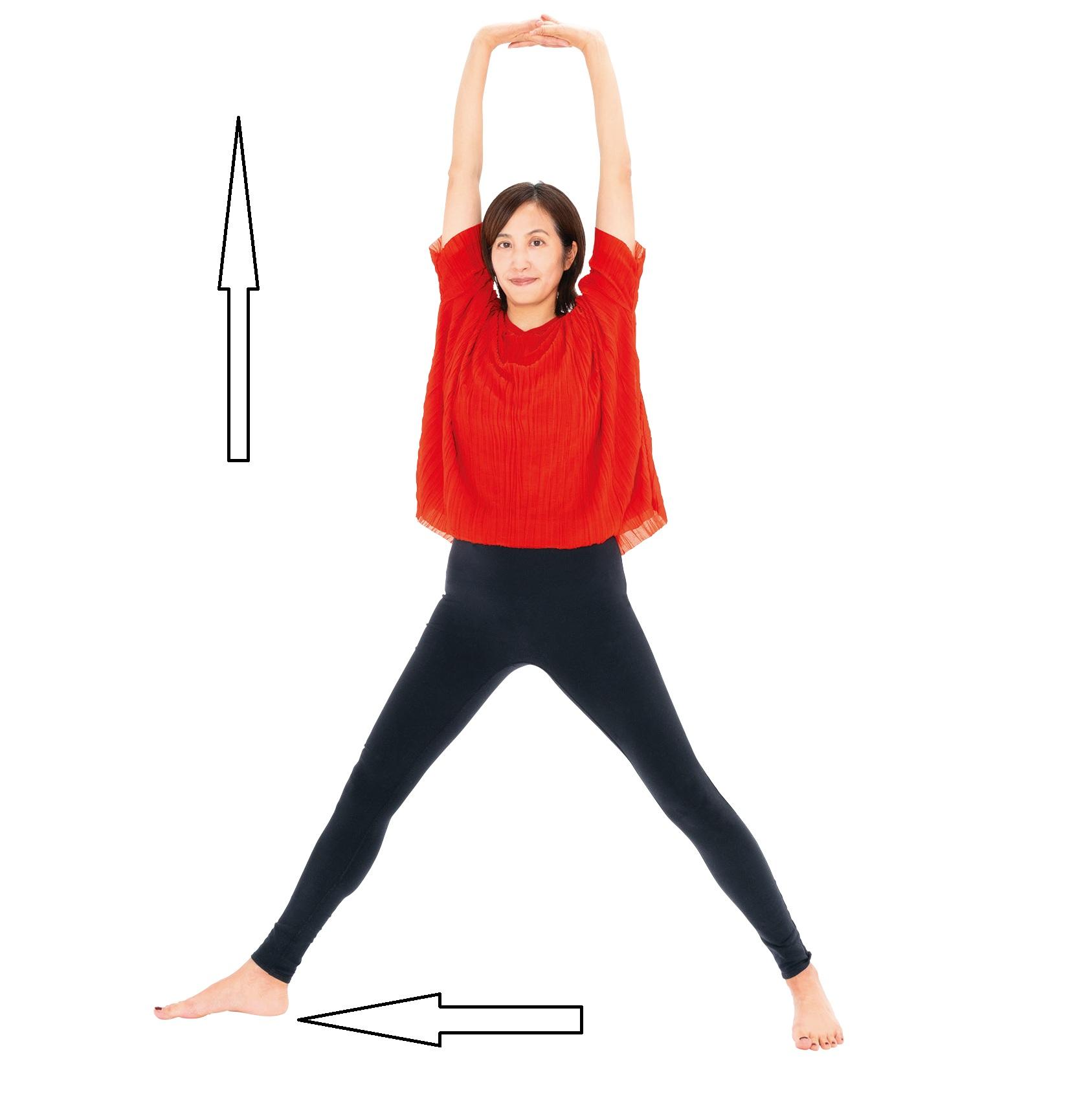 両足を肩幅より広めに開いて立ち、右足のつま先を90度真横に向ける。両手を組み、息を吸いながら腕を真上に伸ばし、上半身を伸ばす。両足は床を強く踏みしめて。