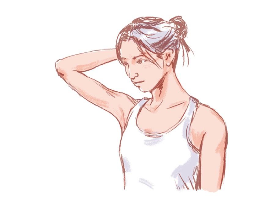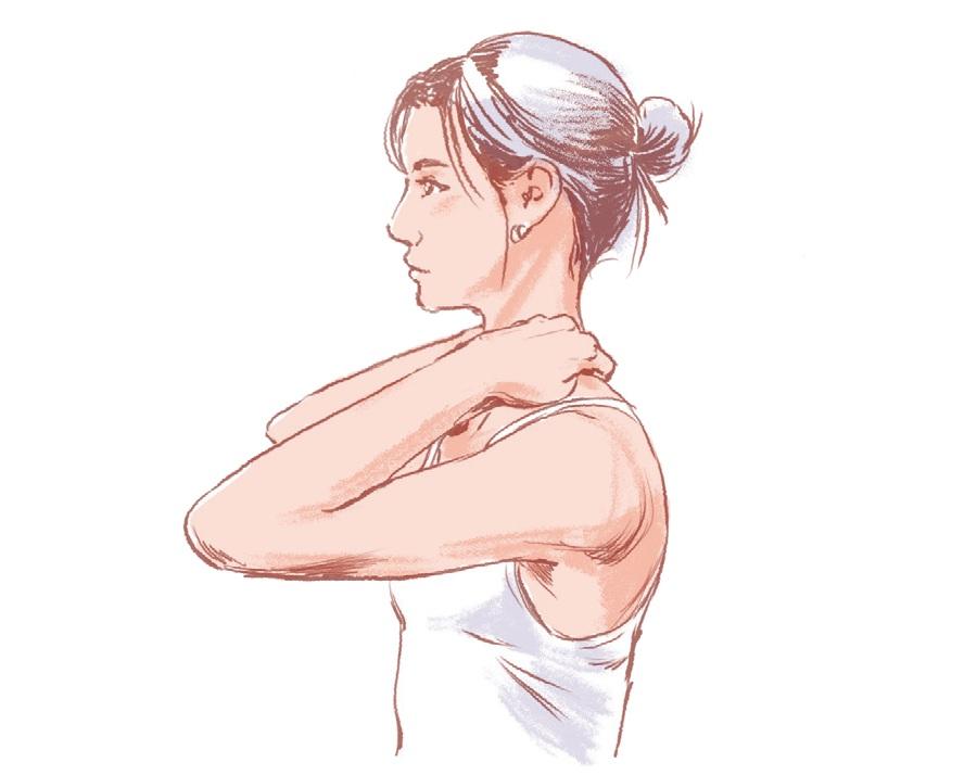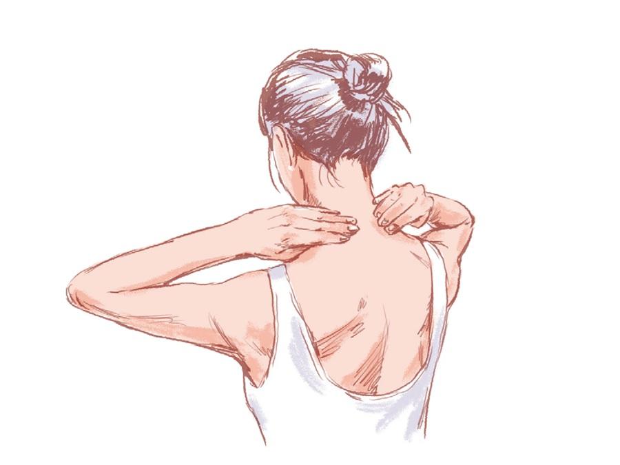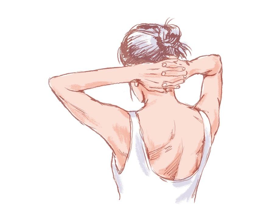 簡単なエクササイズの前にやっておくと、動かしやすくなるマッサージをご紹介。首の後ろに溜まった脂肪を柔らかくして、血流を促そう。どれも、40秒間押さえるだけで、肩が下がるのが実感できるはず。