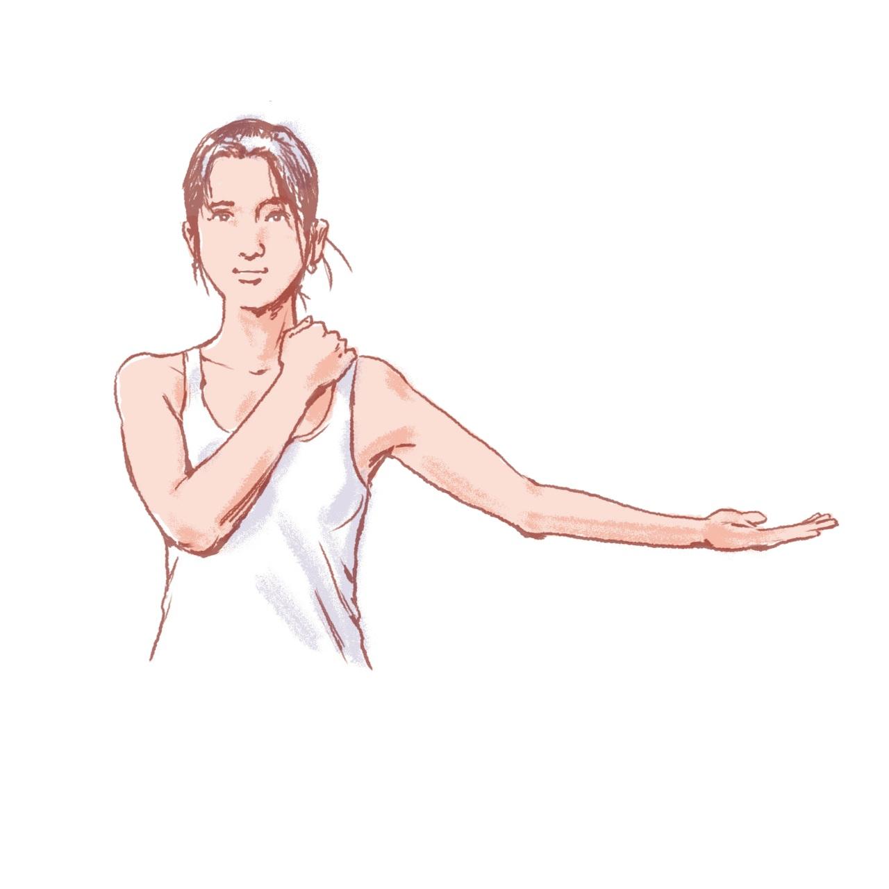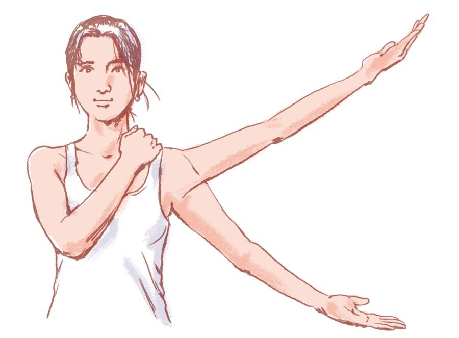 左右各30~40回。肩に置いた指が、肩が上がるのを防ぐストッパーとなり、効果を高める。筋肉が固まっていてこの動きがツラい人は、両腕を同時に後ろに回すだけでもOK。その際も、手のひらは上向きに。