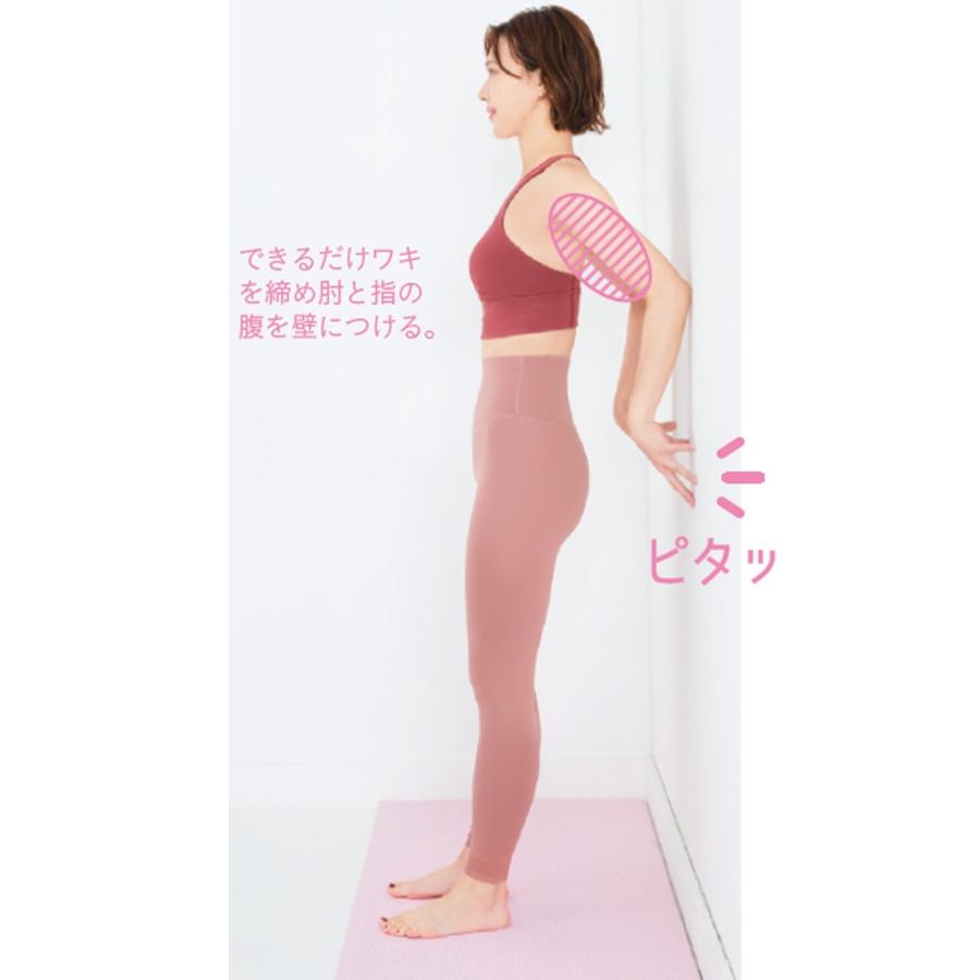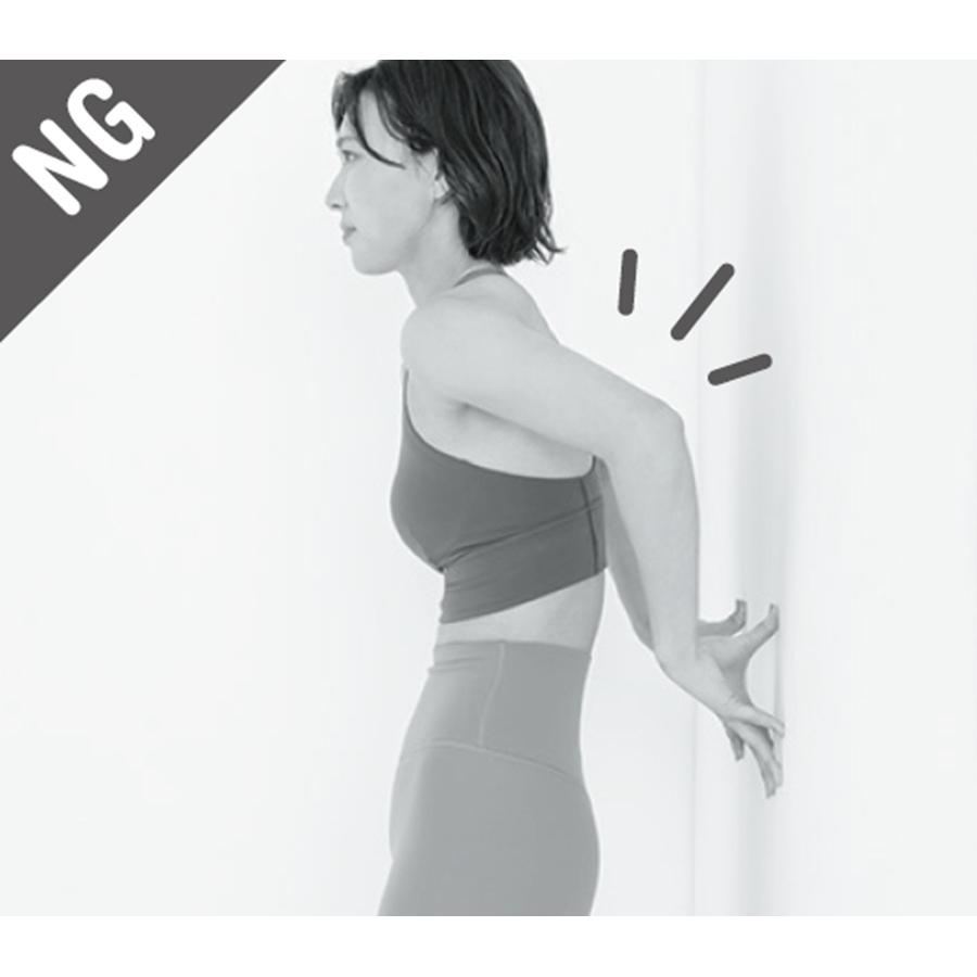 1. 壁から少し離れて立ち、肘と指の腹をつける 壁に背を向け、壁から足1足半くらいの位置に立つ。ワキを締めて肘を壁につき、指の腹も壁につける。手の形は丸く、“カップハンズ”を意識。