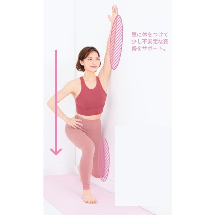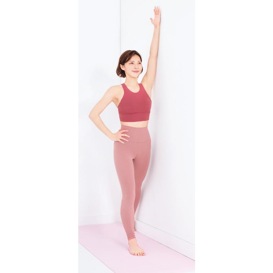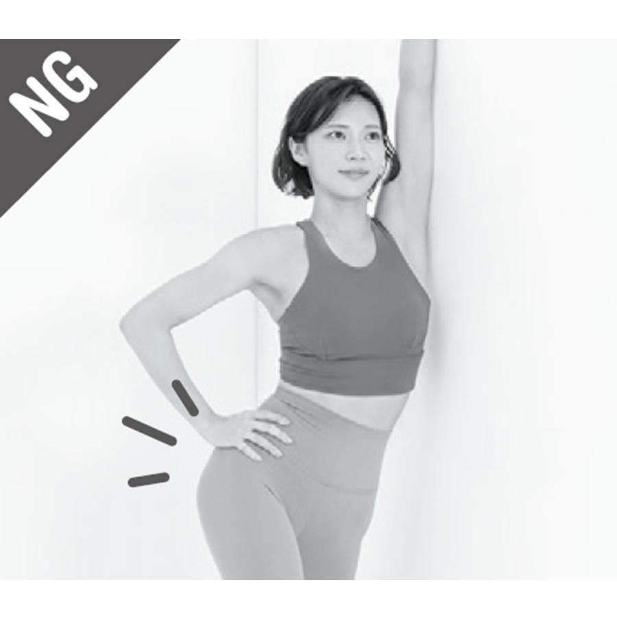 1. 腕を上げ、体側を壁につける 壁のすぐ横に立ち、左手の手の平を内側に向けて腕を上げ、左脚を一歩引きつま先を立てる。右手は腰に。その姿勢のまま壁側の体側を壁につける。