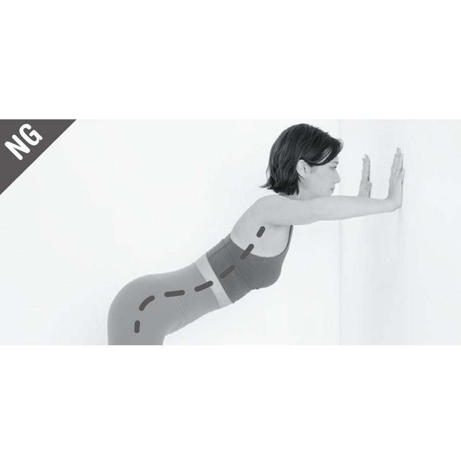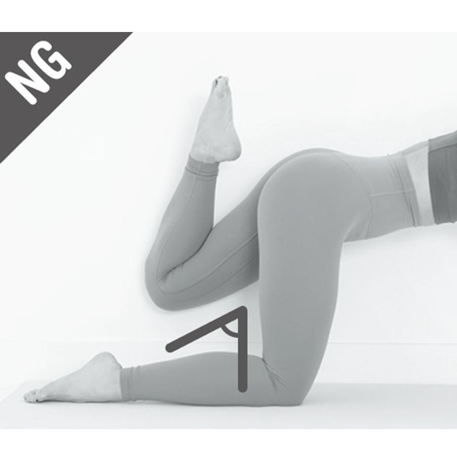 【NG】腰が横に逸れてしまうと、お尻が鍛えられない お尻を下に落とす動作で筋肉が鍛えられるので、このように横に逸れてしまうと、負荷がかからない。壁にしっかり腰をつけて行って。