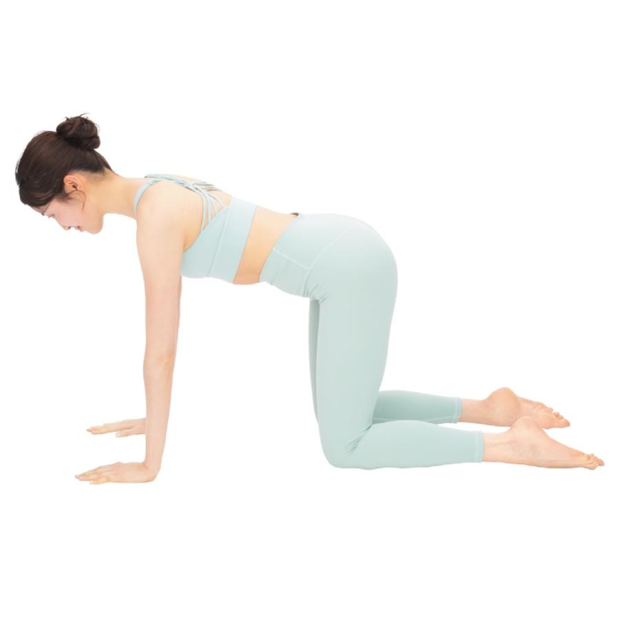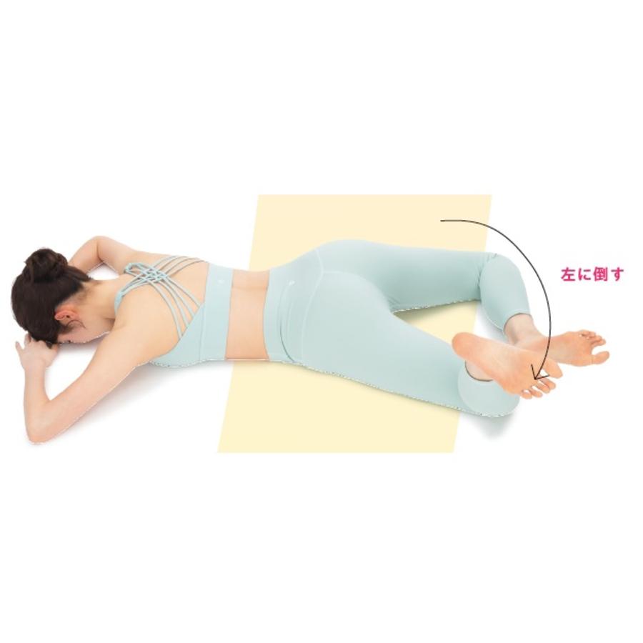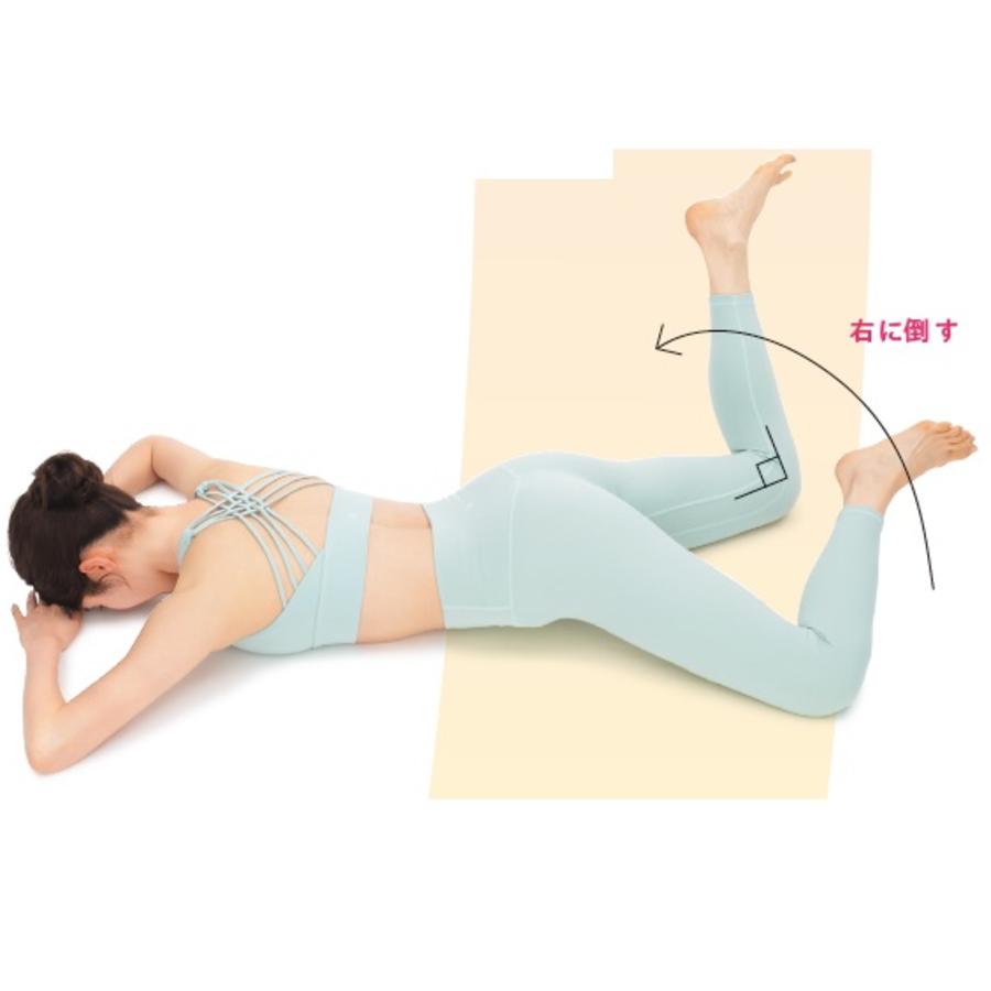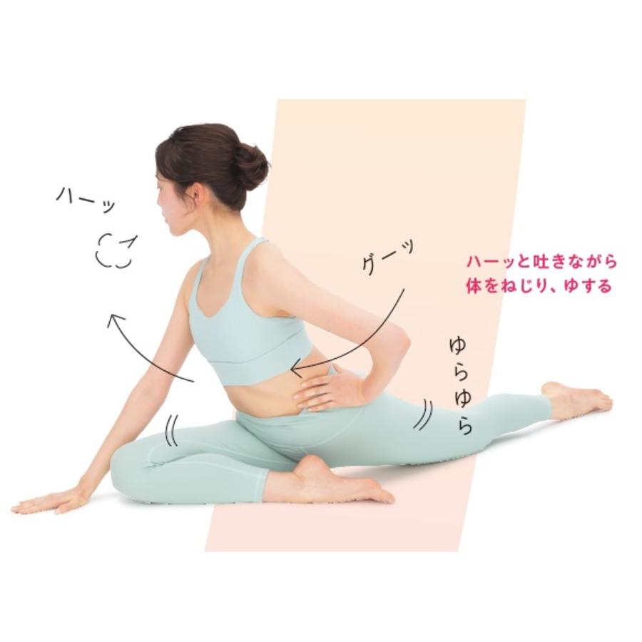 肋骨と骨盤の間を開けて胸を持ち上げるのがポイント。そのまま息を吐きながら体をねじろう。